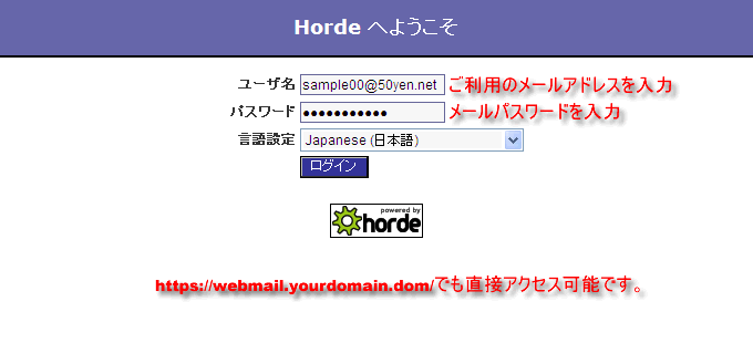 - ※お使いのブラウザから、https://webmail.お客さまのドメイン名/ でもアクセス可能です。