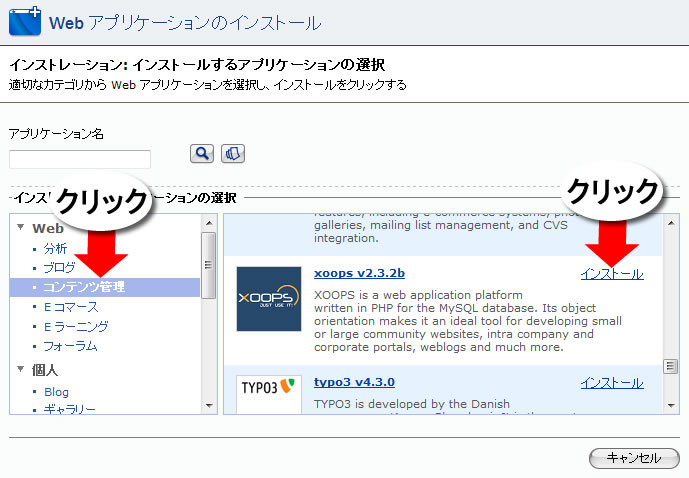 多数自動インストールできるアプリケーションの中からXoopsを選択して「インストール」をクリックしてください。